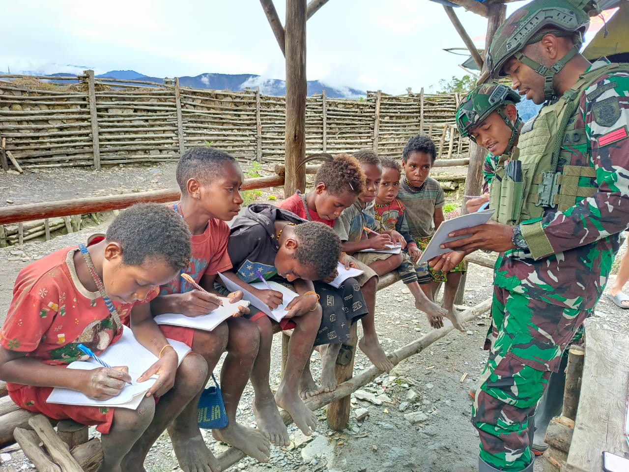Mege’abume – Prajurit Satgas Pamtas Mobile RI-PNG Yonif 323/BP Kostrad dari Pos Pintu Jawa, menebarkan motivasi dan semangat belajar kepada anak-anak di sekitaran Pos dengan membuka kegiatan belajar di Pos, Mege’abume, Distrik Sinak, Kab Puncak, Papua, Jum’at (01/03/2024)