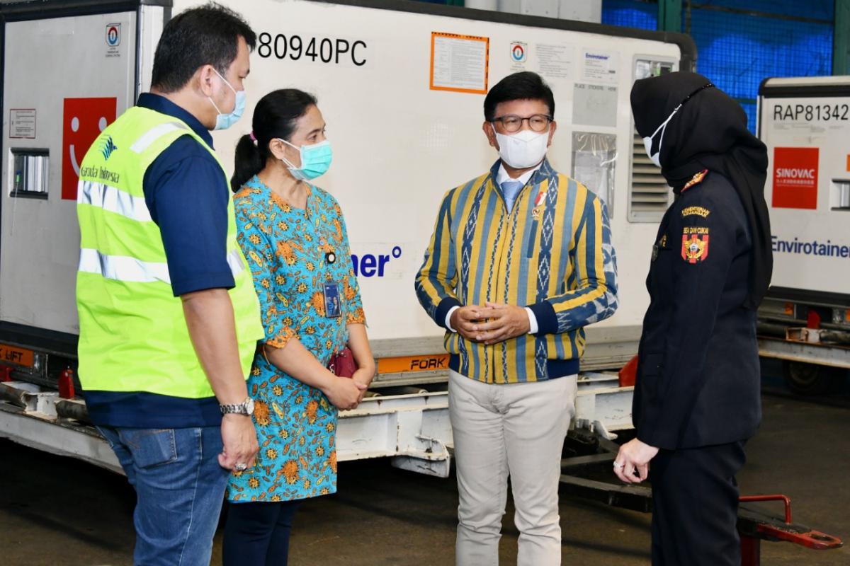 Menteri Komunikasi dan Informatika, Johnny G. Plate yang mewakili Pemerintah Indonesia dalam menyambut kedatangan vaksin di Bandara Soekarno Hatta, Jumat (30/04/2021), menegaskan kembali komitmen pemerintah untuk memastikan stok vaksin bagi masyarakat Indonesia.