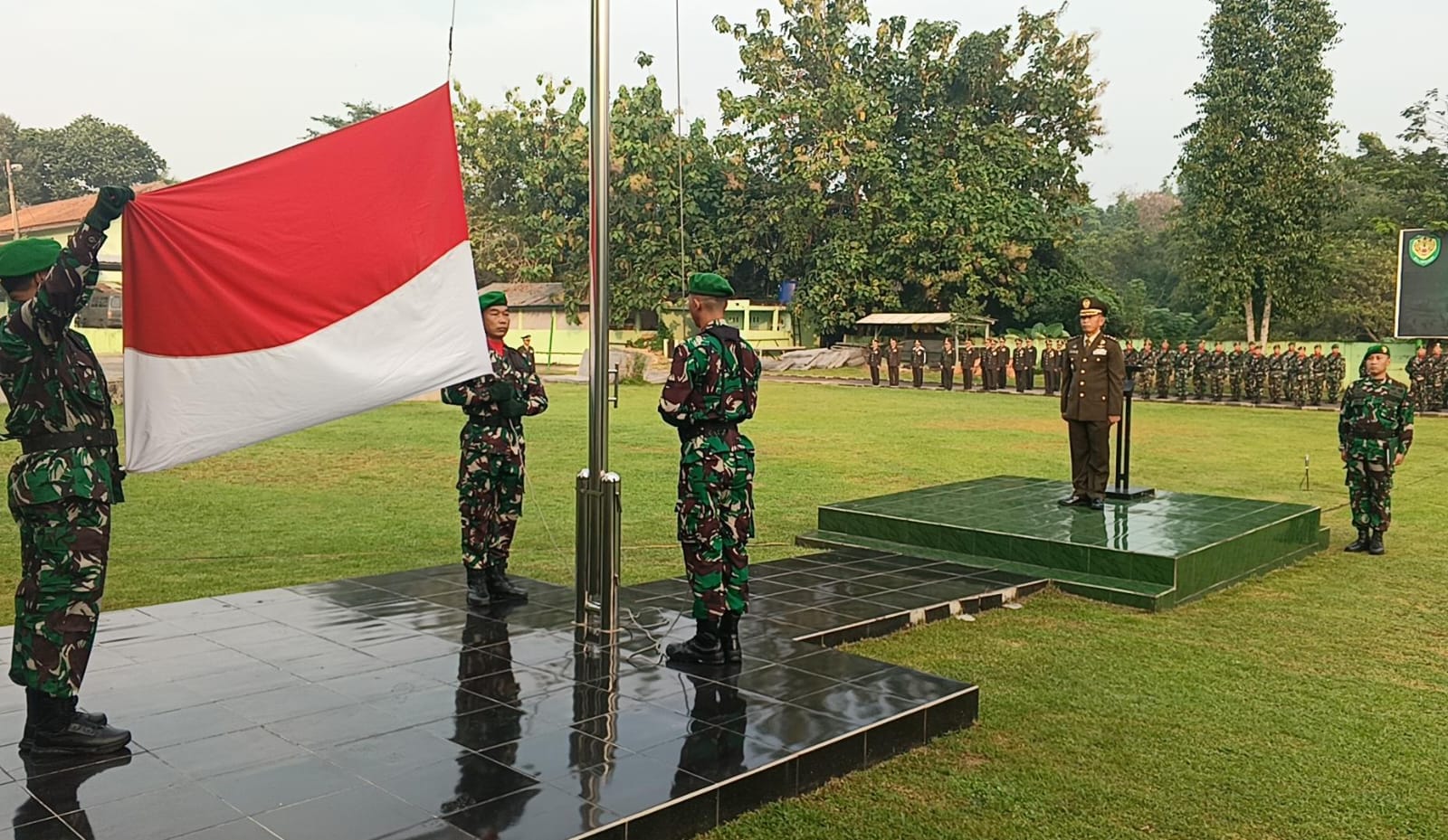 Kota Serang – Kodim 0602/Serang menggelar kegiatan upacara bendera, dalam rangka memperingati peringatan Hari Lahir Pancasila Tahun 2024 yang diikuti seluruh prajurit dan PNS, bertempat di Lapangan Fatahillah Makodim 0602/Serang Kelurahan Tembong Kecamatan Cipocok Jaya, Koa Serang Provinsi Banten, Sabtu (01/06/2024).