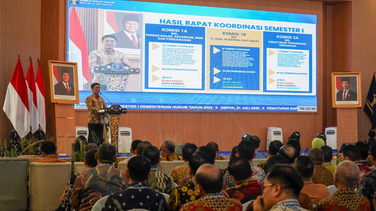 Sekjen Kemenkum Nico Afinta menyampaikan, rakor Pengendalian Kinerja Semester I Tahun 2025 ini menghasilkan 40 target capaian, 77 isu permasalahan, dan 110 rencana tindak lanjut. Sejumlah rekomendasi strategis akan menjadi dasar perbaikan dan penguatan pelaksanaan program kerja di semester berikutnya. Seluruh unit kerja diminta untuk segera menindaklanjuti hasil evaluasi dengan langkah konkret dan terukur.