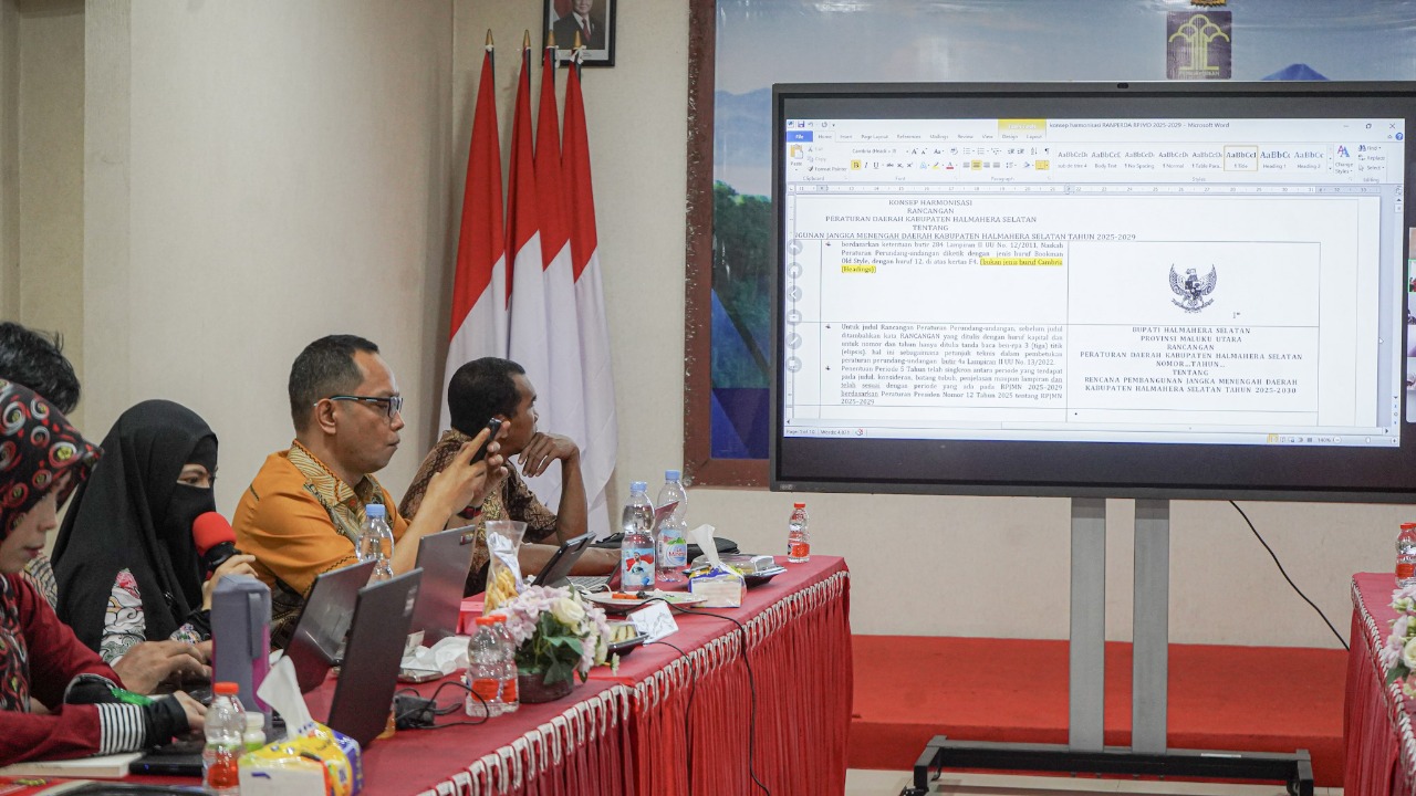 Ternate – Kantor Wilayah Kementerian Hukum Maluku Utara kembali melaksanakan rapat harmonisasi produk hukum daerah, Jumat (1/8) bertempat di Aula Gamalama Kanwil Kemenkum Malut. Agenda rapat kali ini membahas dua rancangan regulasi strategis dari Kabupaten Halmahera Selatan, yaitu Rancangan Peraturan Daerah (Ranperda) tentang Rencana Pembangunan Jangka Menengah Daerah (RPJMD) 2025–2029 dan Rancangan Peraturan Bupati (Ranperbup) tentang Penyelenggaraan Koperasi Desa Merah Putih. Kegiatan ini dibuka oleh Kepala Divisi Peraturan Perundang-undangan dan Pembinaan Hukum Zulfahmi, secara daring. Turut hadir secara langsung Asisten I Setda Halmahera Selatan, Kepala Bagian Hukum, serta perwakilan Bappeda, Dinas Koperasi, dan stakeholder lainnya.
