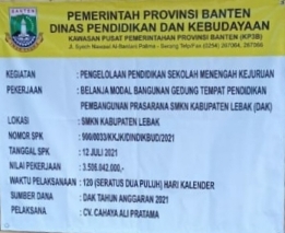 Kegiatan : Pengelolaan PendidikanSekolah Menengah Kejuruan. ” Pekerjaan : Belanja modal bangunan gedung tempat pendidikan Pembangunan prasarana SMKN Kabupaten Lebak (DAK) Lokasi : SMKN Kabupaten Lebak.Nomor SPK 900/0033/KKJK/DINDIKBUD/2021. Tanggal SPK : 12 Juli 2021.Nilai Pekerjaan : 3.505.042.000,-.