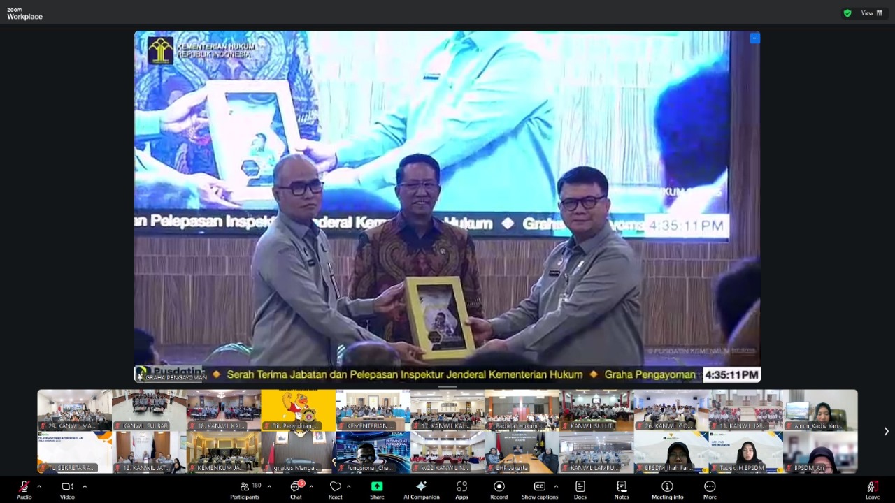 Ternate – Kantor Wilayah (Kanwil) Kementerian Hukum (Kemenkum) Maluku Utara (Malut) mengikuti secara khidmat acara Serah Terima Jabatan dan Pelepasan Inspektur Jenderal Kementerian Hukum, Reynhard Silitonga, yang memasuki masa purnabakti pada Selasa (30/09) melalui platform zoom meeting. Kegiatan ini dipimpin langsung oleh Menteri Hukum, Supratman Andi Agtas dan dihadiri secara virtual oleh seluruh seluruh satuan kerja Kemenkum di Indonesia.