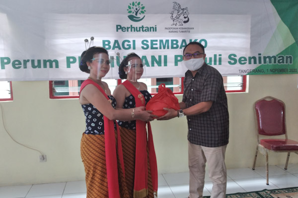 Tangerang – Ratusan seniman dari empat kelompok seni tradisonal terdampak Covid-19 yang tergabung dalam “Mbangun Karso” dapat paket sembako dari Perum Perhutani wilayah Bogor, Minggu 1 November 2020. Penyerahan paket sembako ini digelar pada acara pembukaan Rumah atau “Omah” Budaya pada Padepokan Kebangsaan Karang Tumaritis, Kampung Babagan, Kelurahan Binong, Kabupaten Tangerang.