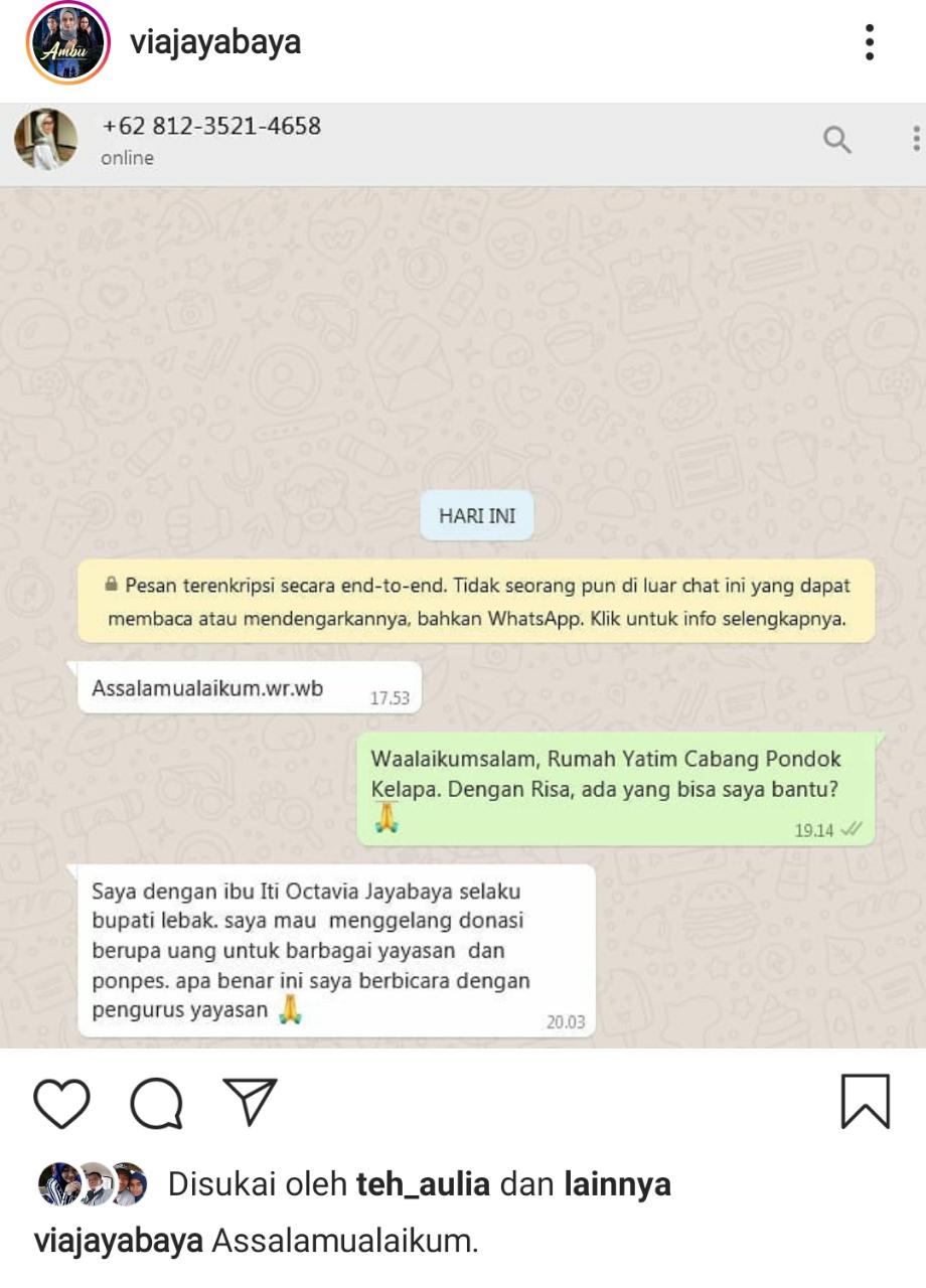 Tentu saja, percakapan tersebut mendapatkan respon dari Bupati Lebak yang asli. Dalam IGnya, Iti membagikan percakapan WA tersebut dengan keterangan agar masyarakat berhati hati karena yang mencatut namanya.