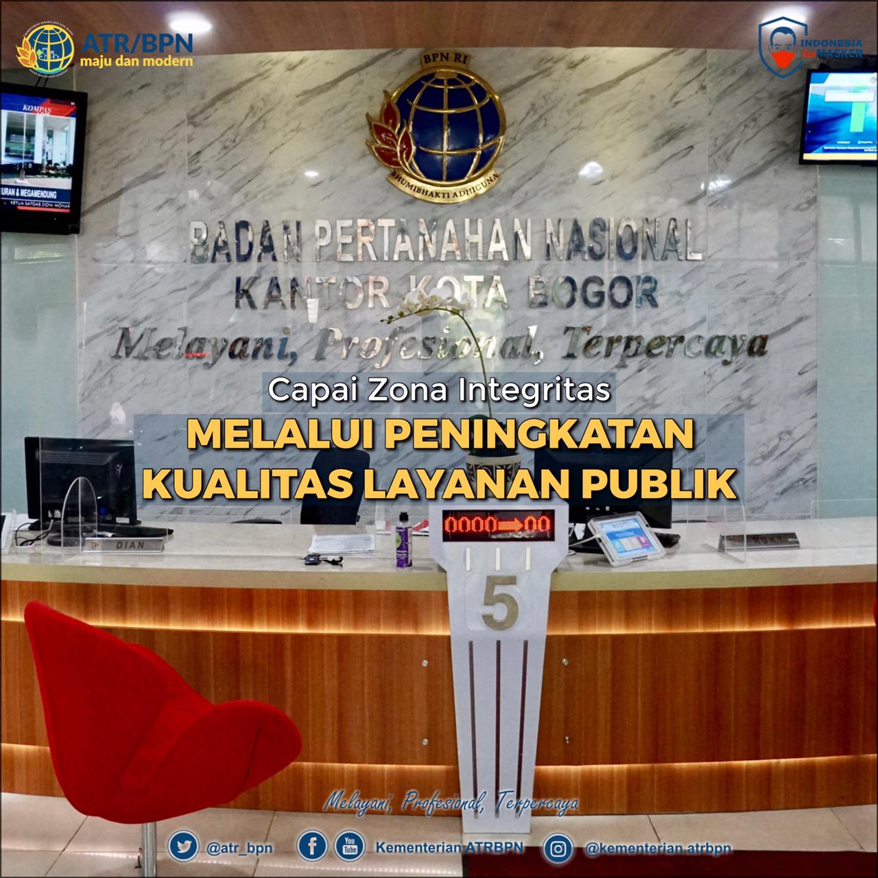 Sebagai salah satu kantor pertanahan yang mempersiapkan diri melaksanakan Zona Integritas, Kantor Pertanahan Kota Bogor terus berupaya memberikan pelayanan publik yang berkualitas. Inovasi dan terobosan yang dilakukan Kantor Pertanahan Kota Bogor antara lain dengan memberikan layanan online POS-BPN Kota Bogor atau Pertanahan Online Services BPN Kota Bogor.
