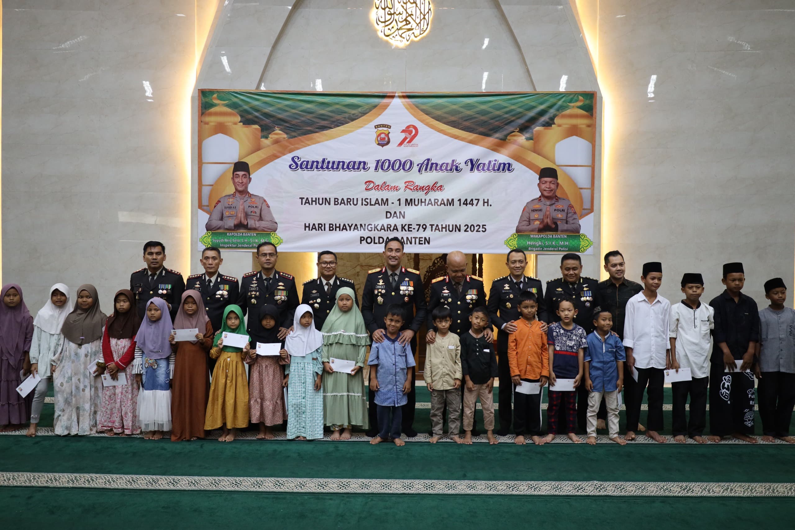 Serang – Dalam rangkaian kegiatan memperingati Hari Bhayangkara ke-79 Tahun 2025, Kapolda Banten Irjen Pol Suyudi Ario Seto Bersama Wakapolda Banten Brigjen Pol H. Hengki didampingi PJU Polda Banten menunjukkan wujud nyata kepedulian sosial dengan memberikan santunan berupa bingkisan kepada 1000 anak yatim piatu yang berasal dari berbagai wilayah di Provinsi Banten. Kegiatan santunan ini berlangsung di Masjid Baiturrahman Polda Banten pada Selasa (01/07).