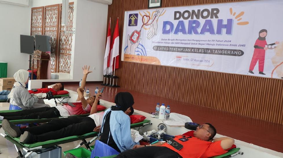 Tangerang, (02/08). Petugas Lembaga Pemasyarakatan (Lapas) Perempuan Kelas IIA Tangerang gelar kegiatan donor darah memperingati Hari Pengayoman. Gandeng Palang Merah Indonesia Kota Tangerang, kegiatan ini bertempat di Aula Lapas Perempuan Kelas IIA Tangerang.