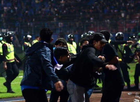 Sejurus kemudian, para penonton di tribun panik, situasi semakin kacau karena mereka berusaha untuk mencari jalan keluar dengan berdesak-desakan.