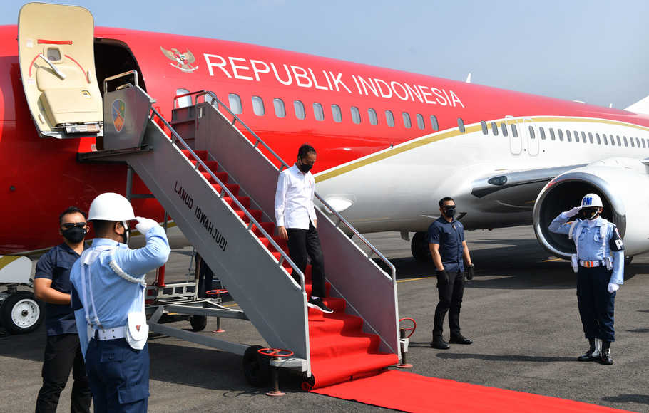 Presiden dan rombongan lepas landas dari Pangkalan TNI AU Halim Perdanakusuma, Jakarta, menggunakan Pesawat Kepresidenan Indonesia-1 sekitar pukul 08.00 WIB dilansir beritasatu.com.