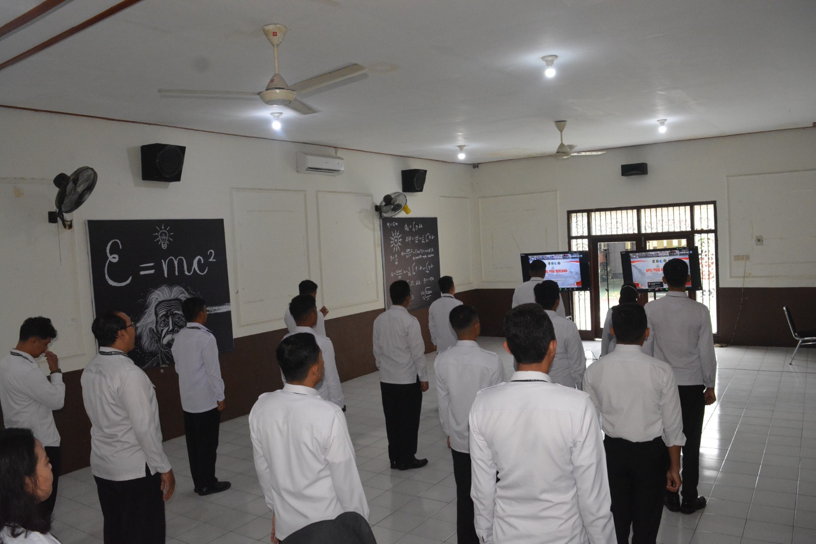 Pasuruan – Seluruh pegawai Rumah Tahanan Negara (Rutan) Kelas IIB Bangil mengikuti Apel Pagi Bersama secara virtual, Senin (03/02). Kegiatan ini merupakan tindak lanjut dari surat Sekretariat Jenderal Kementerian Hukum RI Nomor: SEK-UM.04.01-66, yang menginstruksikan seluruh jajaran untuk mengikuti apel pagi yang dipimpin langsung oleh Wakil Menteri Hukum RI, Edward Omar Sharif Hiariej.
