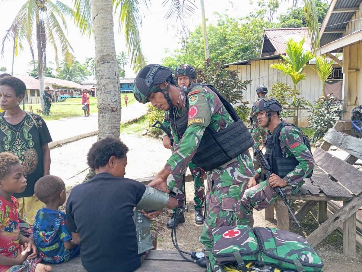 Keerom – Untuk menjaga kondisi kesehatan masyarakat di Perbatasan, Pos Yabanda Satgas Yonif 310/KK melaksanakan anjangsana dan patroli pelayanan kesehatan di Kampung Yabanda, Distrik Yaffi, Kabupaten Keerom, Selasa (2/4/2024).