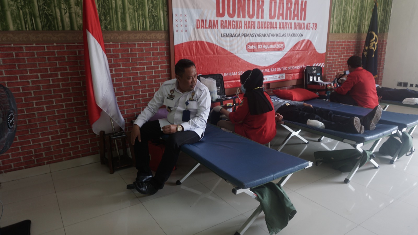 Kegiatan donor darah yang digelar ruang serba guna ini bekerja sama dengan Palang Merah Indonesia (PMI) Kota Cilegon. Turut hadir, Kepala Lembaga Pemasyarakatan (Kalapas) Kelas IIA Cilegon, Enjat Lukmanul Hakim untuk ikut serta mendonorkan darahnya.