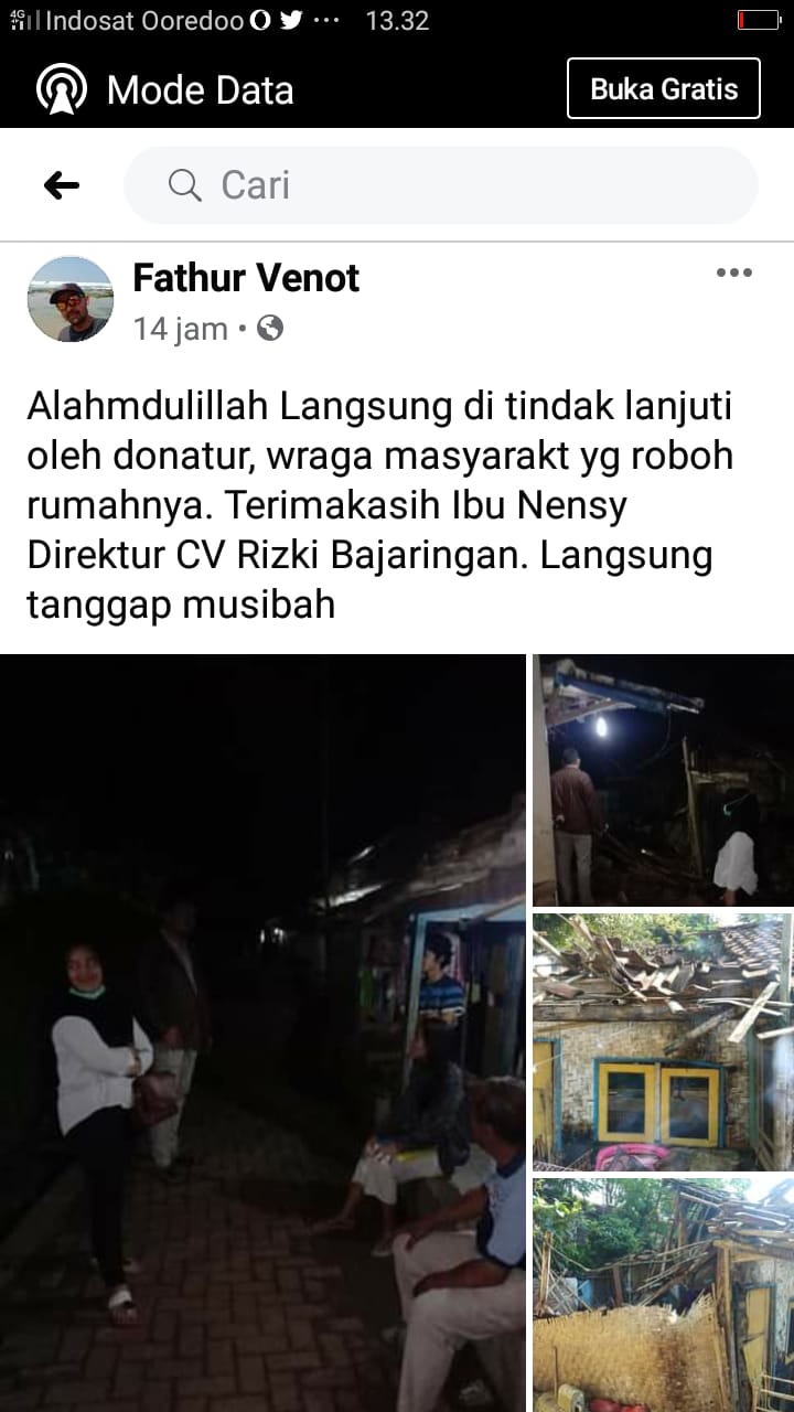 “Alhamdulillah, langsung ditindak lanjuti oleh donatur, warga masyarakat yang roboh rumahnya. Terimakasih Ibu Nensy Direktur CV Rizki Bajaringan. Langsung tanggap musibah.” demikian status facebook Fathur Venot dengan unggahan beberapa poto seorang wanita yang sedang melihat rumah yang roboh itu.