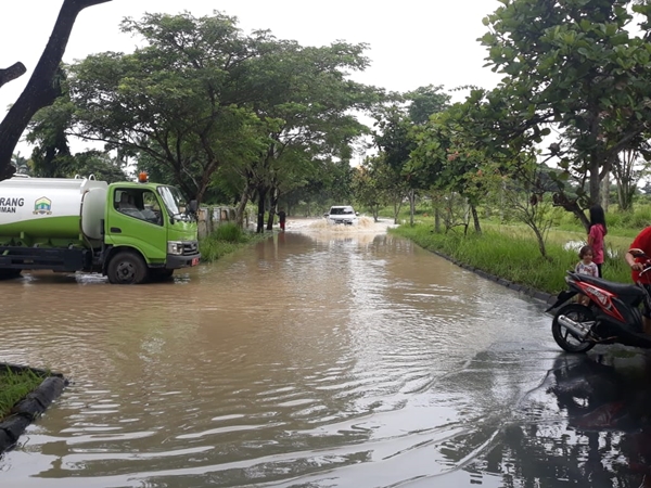 Siberindo.co – Hujan deras dini hari mengakibatkan genanggan air di jalan menuju kantor Pemerintahan Kota Serang, Banten, menjadi terhambat.