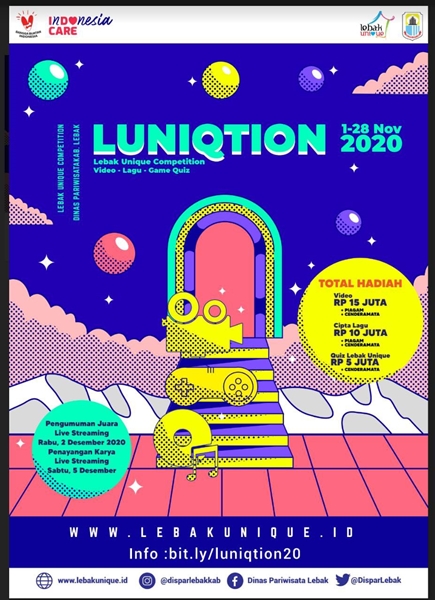 Siberindo.co – Lomba Lebak Unique Competition (Luniqtion) yang Dinas Pariwisata Kabupaten Lebak diselenggarakan secara virtual dengan memperebutkan total hadiah Rp 30 juta. Peserta Luniqtion diikuti puluhan masyarakat umum baik dari Banten sampai Jakarta dari tanggal 1 – 28 November 2020.