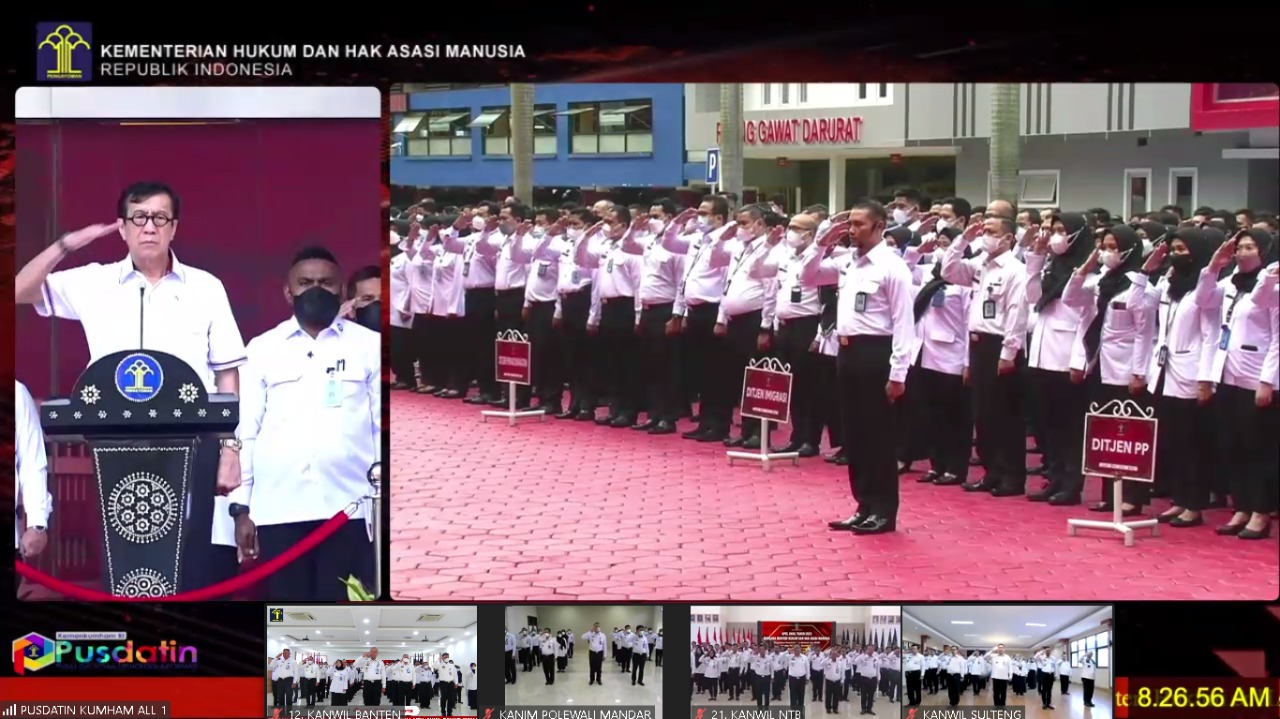 Terselenggara secara Hybrid, Apel Awal Tahun turut diikuti jajaran Kantor Wilayah dan Satuan Kerja Kemenkumham seluruh Indonesia melalui Zoom Meeting. Di Kanwil Kemenkumham Banten, Apel Awal Tahun diikuti Kepala Kanwil Kemenkumham Banten, Tejo Harwanto dan jajaran bertempat di Aula Lantai III Kanwil Kemenkumham Banten.
