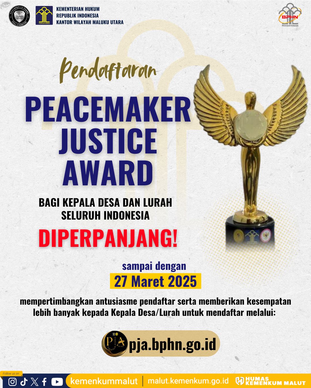 Ternate – Kementerian Hukum (Kemenkum) melalui Badan Pembinaan Hukum Nasional (BPHN) mengumumkan perpanjangan waktu pendaftaran Peacemaker Justice Award (PJA) bagi para kepala desa dan lurah di Indonesia.