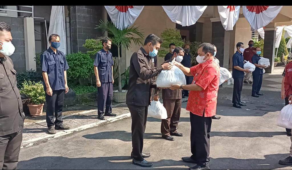 UNGARAN – Sebanyak 55 orang pekerja non-PNS di lingkungan Sekretariat Daerah (Setda) Kabupaten Semarang, yakni petugas kebersihan dan tenaga kontrak, termasuk petugas keamanan dalam (PKD) menerima bantuan paket sembako. Bantuan diserahkan secara simbolis oleh Bupati Semarang Ngesti Nugraha di halaman kantor bupati setempat, Selasa (3/8/2021) pagi.