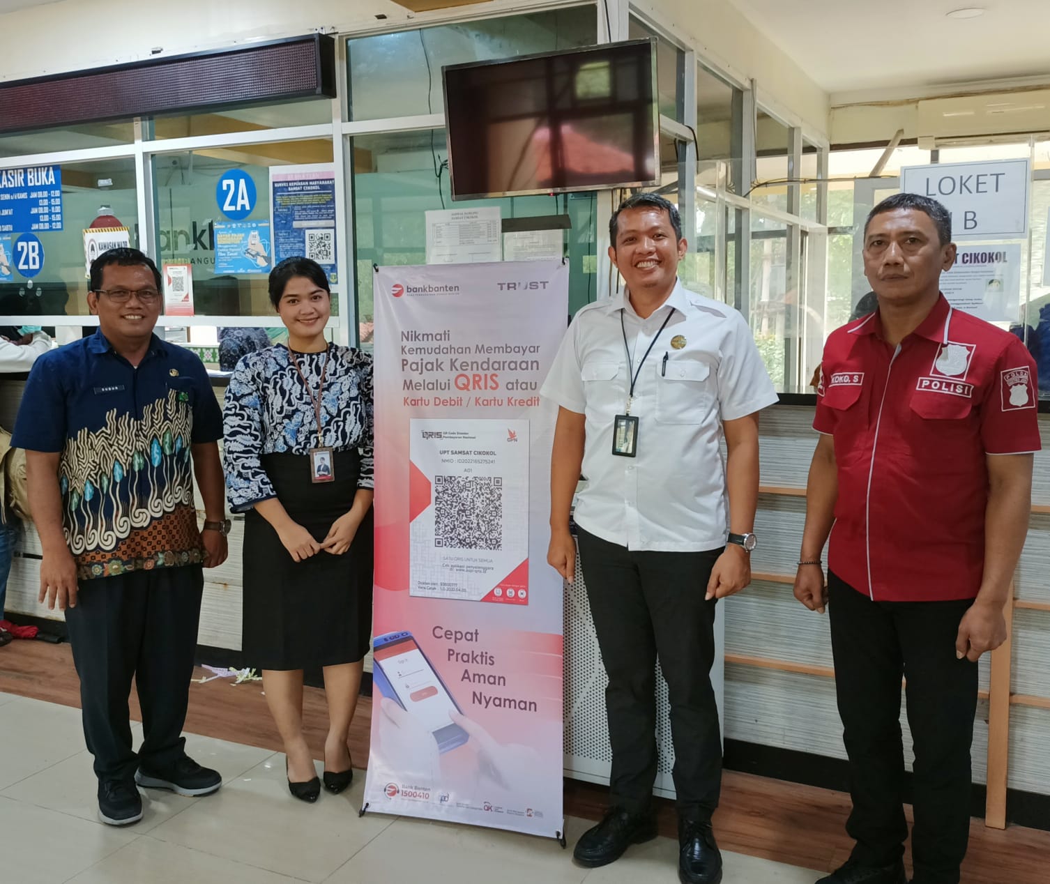 TANGERANG – Tim Pembina SAMSAT Provinsi Banten kembangkan sistem pembayaran non tunai dengan Q RIS (quick response code Indonesian standard). Badan Pendapatan Daerah Provinsi Banten, PT Jasa Raharja Cabang Banten, Polda Banten, Polda Metro Jaya bersama Bank Banten bekerja sama lakukan inovasi sistem pembayaran non tunai dengan QRIS, yang sebelumnya Tim Pembina Samsat Provinsi Banten juga telah lebih dulu menyediakan sistem pembayaran non tunai dengan mesin EDC.
