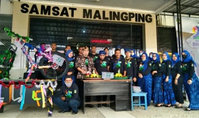 LEBAK – Untuk memperingati hari jadi Provinsi Banten yang ke-21 dan sebagai bentuk rasa syukur, Unit Pelayanan Teknis Daerah (UPTD) Samsat Malingping menggelar potong tumpeng di halaman depan Kantor Samsat Malingping, tepatnya di Jalan Baru Simpang – Beyeh, Kecamatan Malingping, Kabupaten Lebak, Provinsi Banten. Senin (4/10/2021) Dikutip Bungasbanten.id – Group siberindo.co