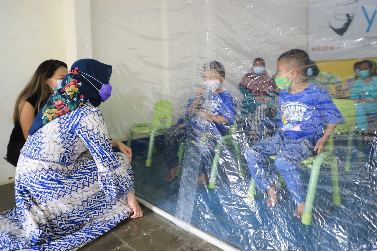 SEMARANG – Sejumlah anak antusias menyambut kedatangan istri Gubernur Jawa Tengah, Atikoh Ganjar Pranowo, di Rumah Yayasan Kasih Anak Kanker Indonesia (YKAKI) Cabang Semarang, Kompleks Rumah KAI Randusari, Jumat (3/12/2021). Meski harus dibatasi dengan tirai plastik, namun tak menghalangi kebahagiaan mereka bertemu dengan Ibunya Jateng ini.