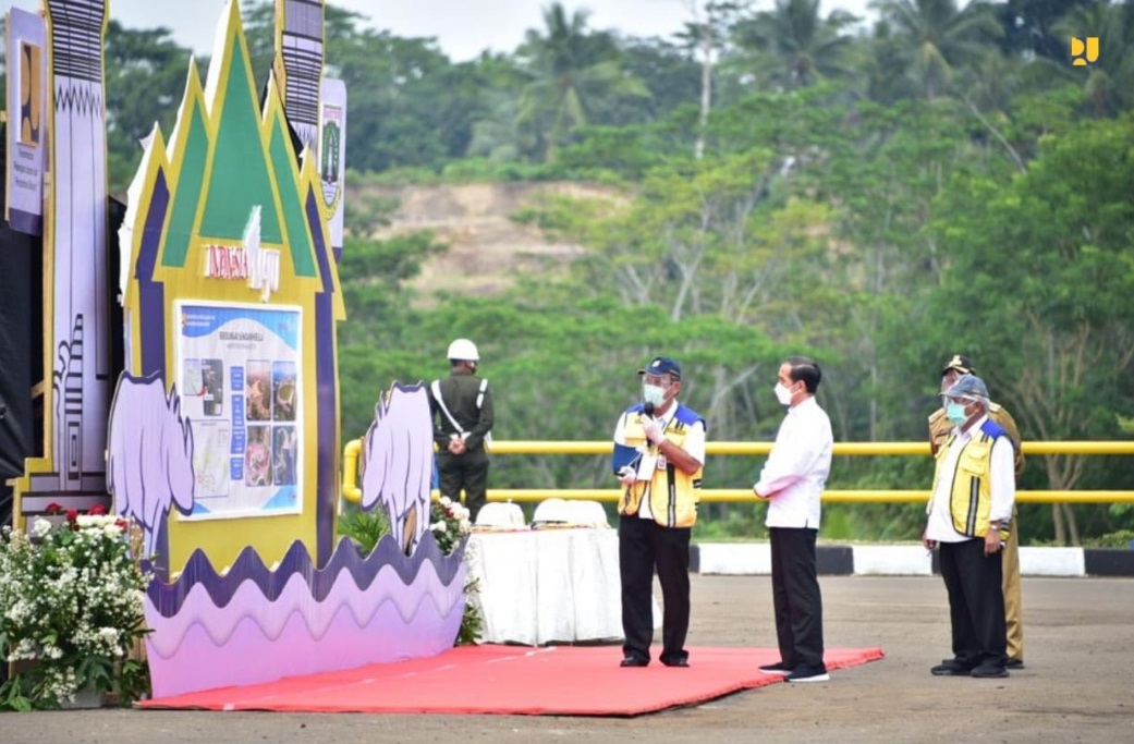 SERANG – Presiden Joko Widodo (Jokowi) didampingi Menteri Pekerjaan Umum dan Perumahan Rakyat (PUPR) Basuki Hadimuljono, Kepala Staf Kepresidenan Moeldoko, Gubernur Banten Wahidin Halim, dan Direktur Utama PT PP Novel Arsyad meresmikan Bendungan Sindangheula yang berada di Kabupaten Serang, Provinsi Banten, Kamis (4/3/2021).