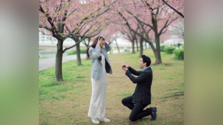 Dalam foto itu, keduanya tengah berada di taman yang indah di Tokyo. Lewat foto-foto yang bercerita, mereka bergandengan tangan dan berlari kecil di tangan. Foto berikutnya memperlihatkan Luna Maya tengah berdiri memotret keindahan bunga sakura. Di belakangnya, Maxime Bouttier berdiri untuk mempersiapkan kejutan. Slide berikutnya memperlihatkan aktor yang membintangi film Hollywood, Ticket to Paradise itu berlutut sambil membuka kotak cincin dan Luna Maya terlihat kaget. Keduanya berangkulan setelah perempuan berusia 41 tahun itu menerima lamaran Maxime.
