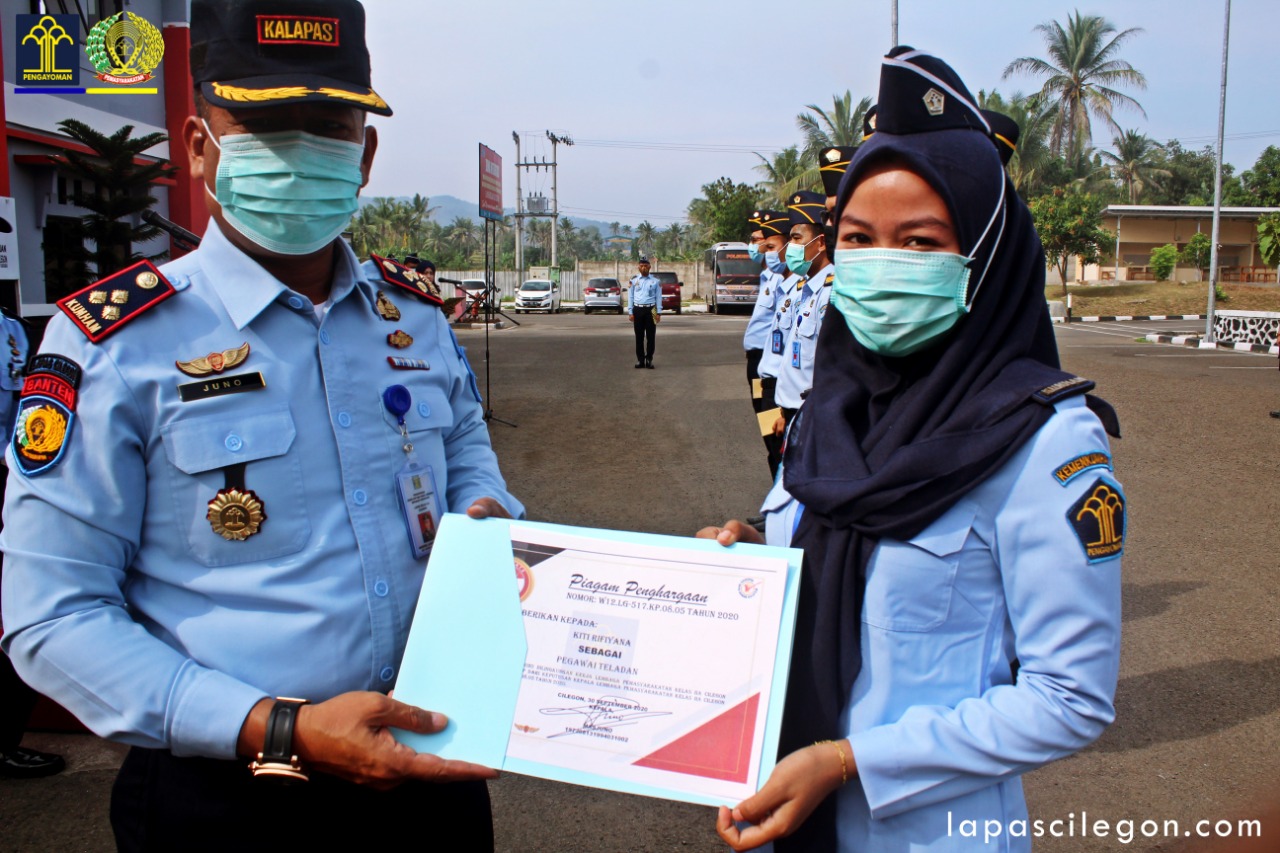 KOTA CILEGON – Lembaga pemasyarakatan (Lapas) Kelas IIA Cilegon meyematkan pangkat kepada 5 Putra Terbaik Lapas Cilegon diantaranya Oki Setiawan, Endi Suhendi, Kiki Rifki, Agus Triono, dan Rio Aditya Sandi dalam Apel Pagi Pegawai, Senin (05/10/2020).
