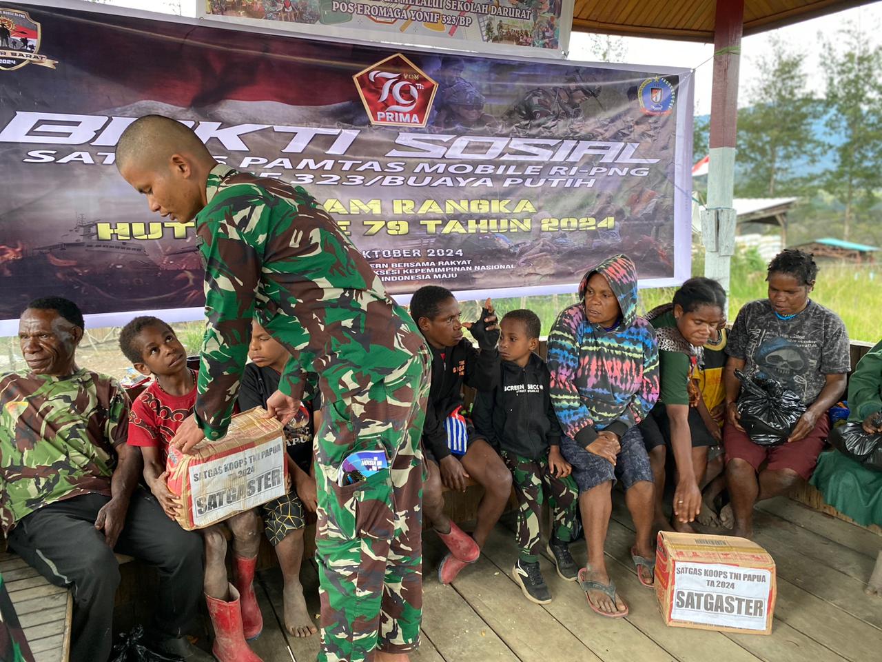 Pada hari Kamis, (3/10/2024), Satgas Yonif 323 Kostrad, khususnya Pos Eromaga pimpinan Lettu Inf Anggun, mewujudkan kepedulian sosial melalui pemberian Paket Sembako kepada warga Kampung Eromaga, Distrik Omukia, dalam rangka memperingati Hari Ulang Tahun ke-79 TNI.