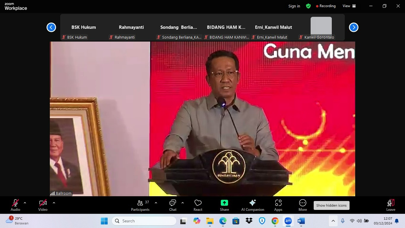 Ternate – Kantor Wilayah Kementerian Hukum dan Hak Asasi Manusia (Kanwil Kemenkumham Malut) hadiri kegiatan Refleksi Akhir Tahun yang diselenggarakan oleh Badan Strategi Kebijakan Kementerian Hukum secara virtual.