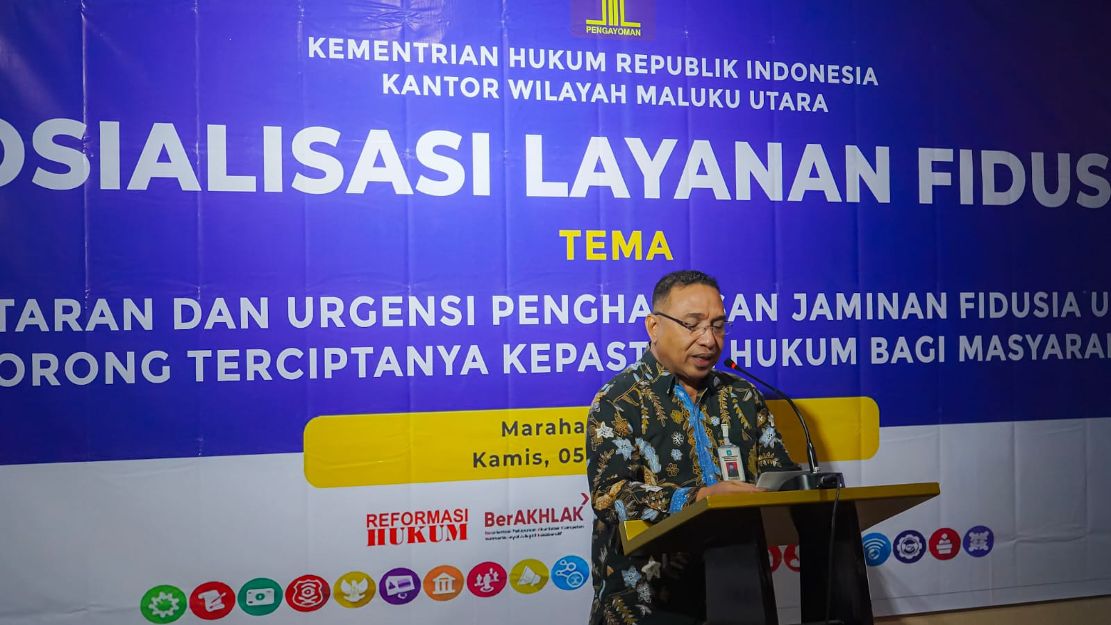 Tobelo – Kantor Wilayah (Kanwil) Kementerian Hukum (Kemenkum) Maluku Utara (Malut) melaksanakan Sosialisasi Jaminan Fidusia di Kabupaten Halmahera Utara (Halut).
