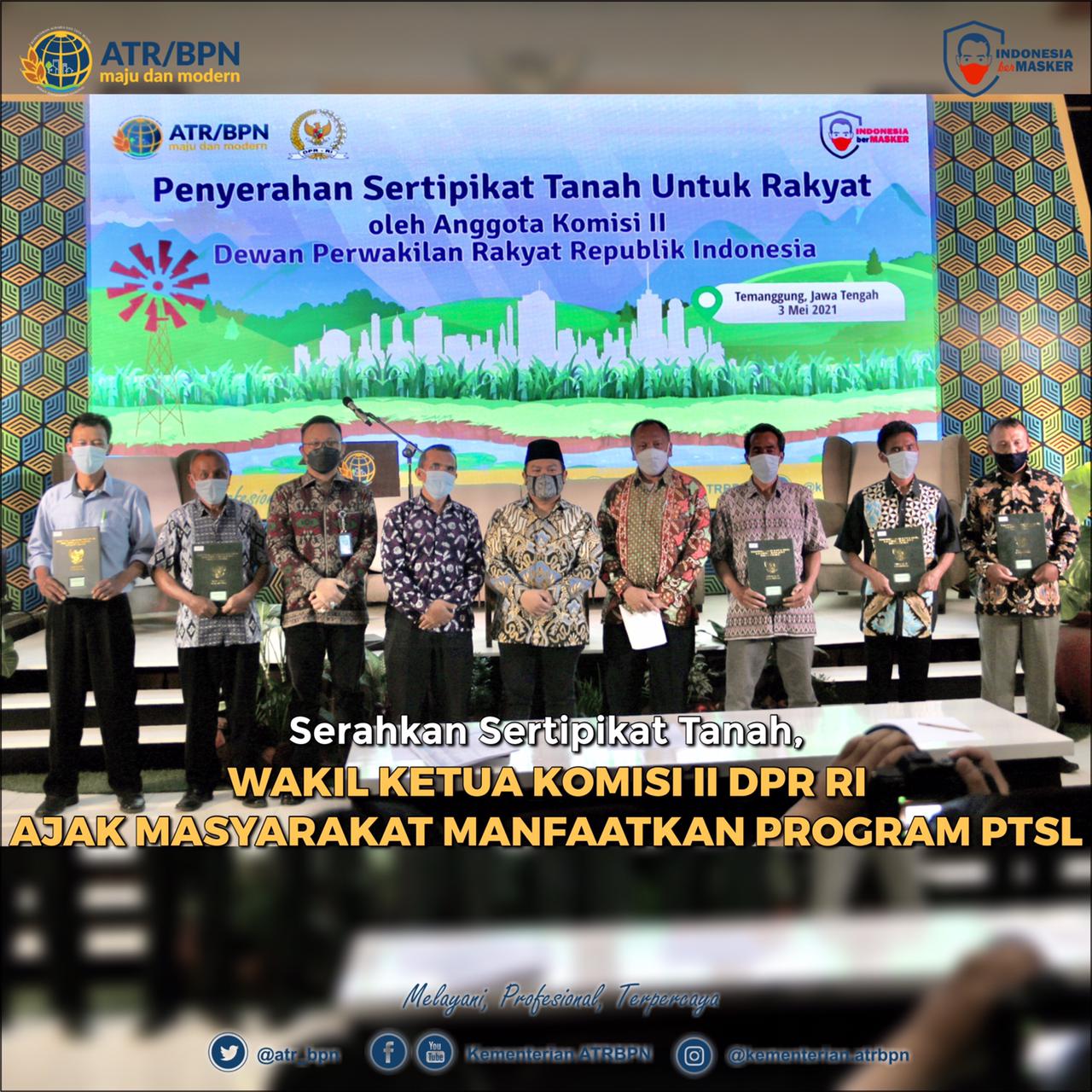 Temanggung – Kementerian Agraria dan Tata Ruang/Badan Pertanahan Nasional (ATR/BPN) bersama Komisi II DPR RI menyelenggarakan Sosialisasi Program Strategis. Untuk pertama kali di tahun 2021, kegiatan ini diselenggarakan di Kabupaten Temanggung, Provinsi Jawa Tengah. Salah satu yang disosialisasikan pada kesempatan kali ini adalah pelaksanaan PTSL di Kabupaten Temanggung.