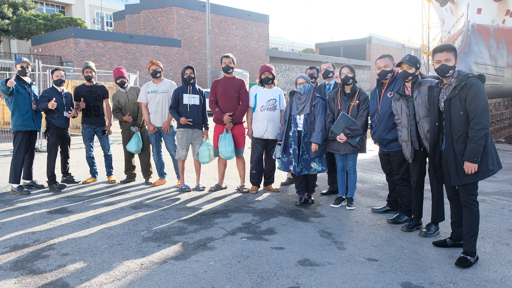 Cape Town, Afrika Selatan – Perwakilan RI di luar negeri senantiasa memberikan bantuan, pelindungan dan pelayanan bagi para WNI di luar negeri terutama di masa pandemi. KJRI Cape Town salurkan bantuan logistik berupa paket makanan serta alat proteksi diri bagi para WNI yang bekerja sebagai Anak Buah Kapal (ABK) di kapal-kapal nelayan (20/05/2021).