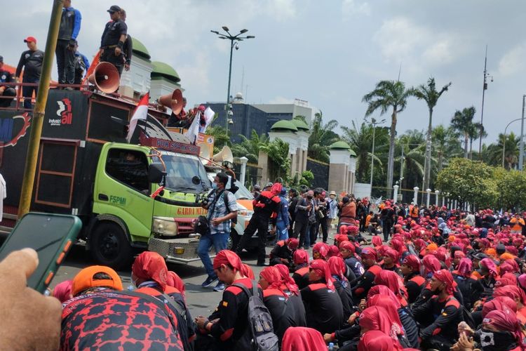 Pukul 10.40 WIB, ratusan buruh yang menggunakan seragam berwarna hitam itu berjalan kaki dari arah jalan layang Senayan Jakarta Pusat ke arah pintu utama Gedung DPR RI. Kerumunan buruh yang melakukan demo hampir memenuhi sisi Jalan Gatot Subroto (Gatsu) yang mengarah ke Slipi.