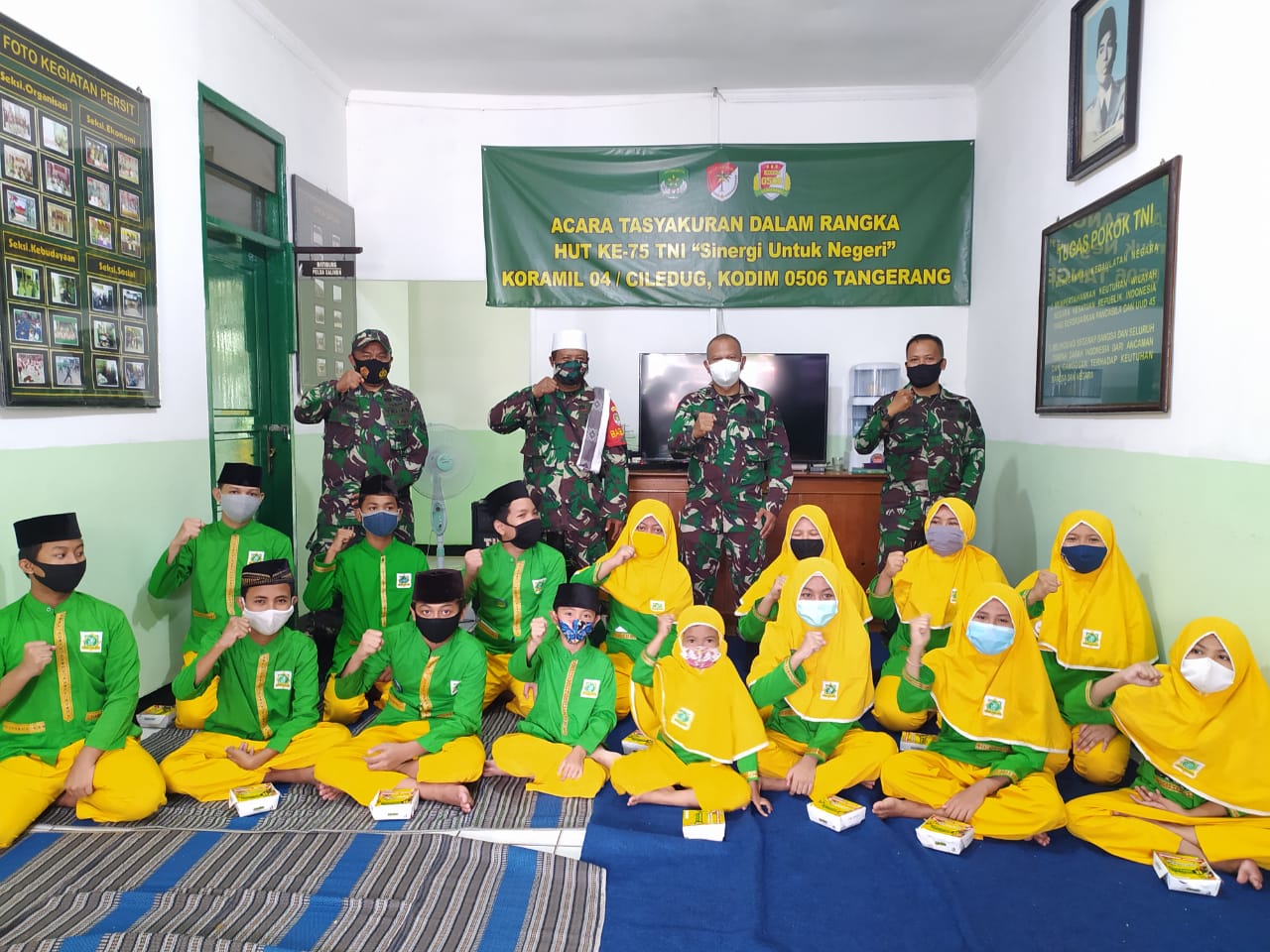 “Tasyakuran dalam rangka HUT ke – 75 TNI ‘Sinergi untuk Negri’, sekaligus wujud syukur atas kenaikan pangkat tiga personil Koramil 04/ Ciledug, dengan do’a bersama dan berbagi rezeki tehadap adik-adik Yatim piatu,” ungkapnya kepada Wartawan.
