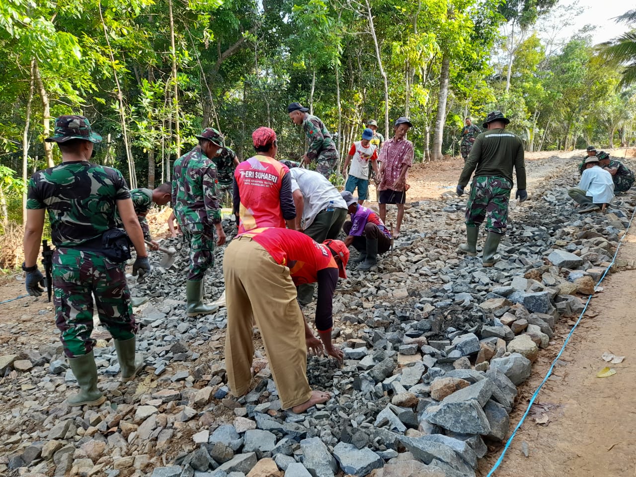 PANDEGLANG – TMMD ke-1049 Kodim 0601Pandeglang yang di gelar di Kecamatan Patia Kabupaten Pandeglang memasuki hari ke 14, pekerjaan fisik pembuatan badan mencapai 60 peresen lebih. Hal itu dapat terwujud berkat kerjasama antara Satgas TMMD dan warga masyarakat, bahu membahu bekerja sama dalam setiap target pekerjaan yang telah diberikan, sehingga hasil dapat dicapai dengan maksimal, Senin (5/10/20).