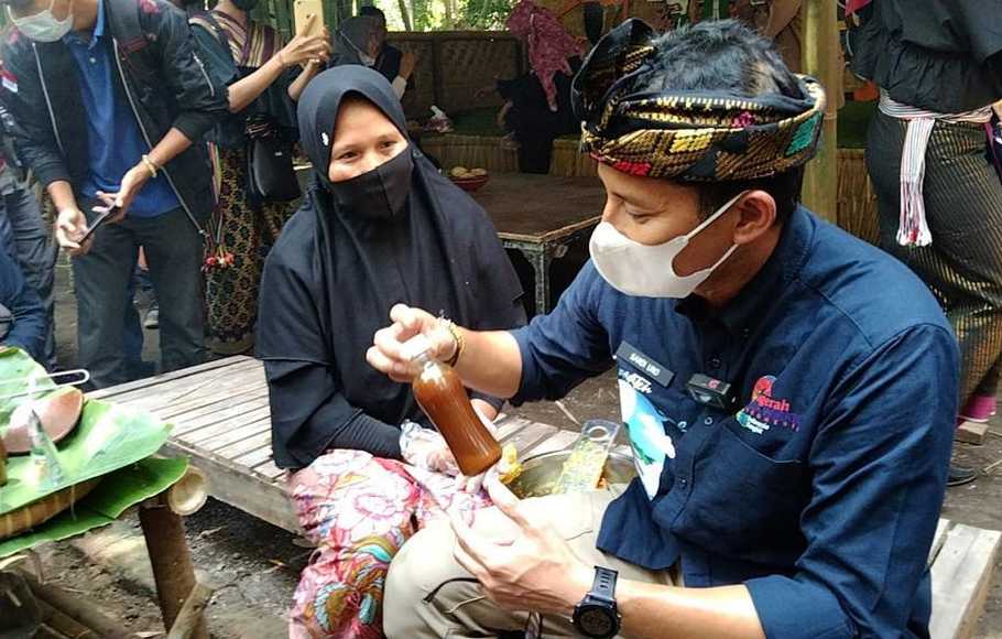 Lombok – Menteri Pariwisata dan Ekonomi Kreatif (Menparekraf) Sandiaga Salahuddin Uno singgah ke Desa Wisata Bonjeruk, dalam kunjungan kerja ke Lombok, Nusa Tenggara Barat (NTB). Di sana ia berjumpa dengan penjual jamu tradisional.