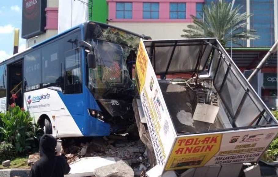 Diketahui, sebuah bus Transjakarta dengan nomor polisi B 7069 PGA menabrak pos lalu lintas di simpang Pusat Grosir Cililitan (PGC), Jakarta Timur, Kamis (2/12/2021).(*/cr2)