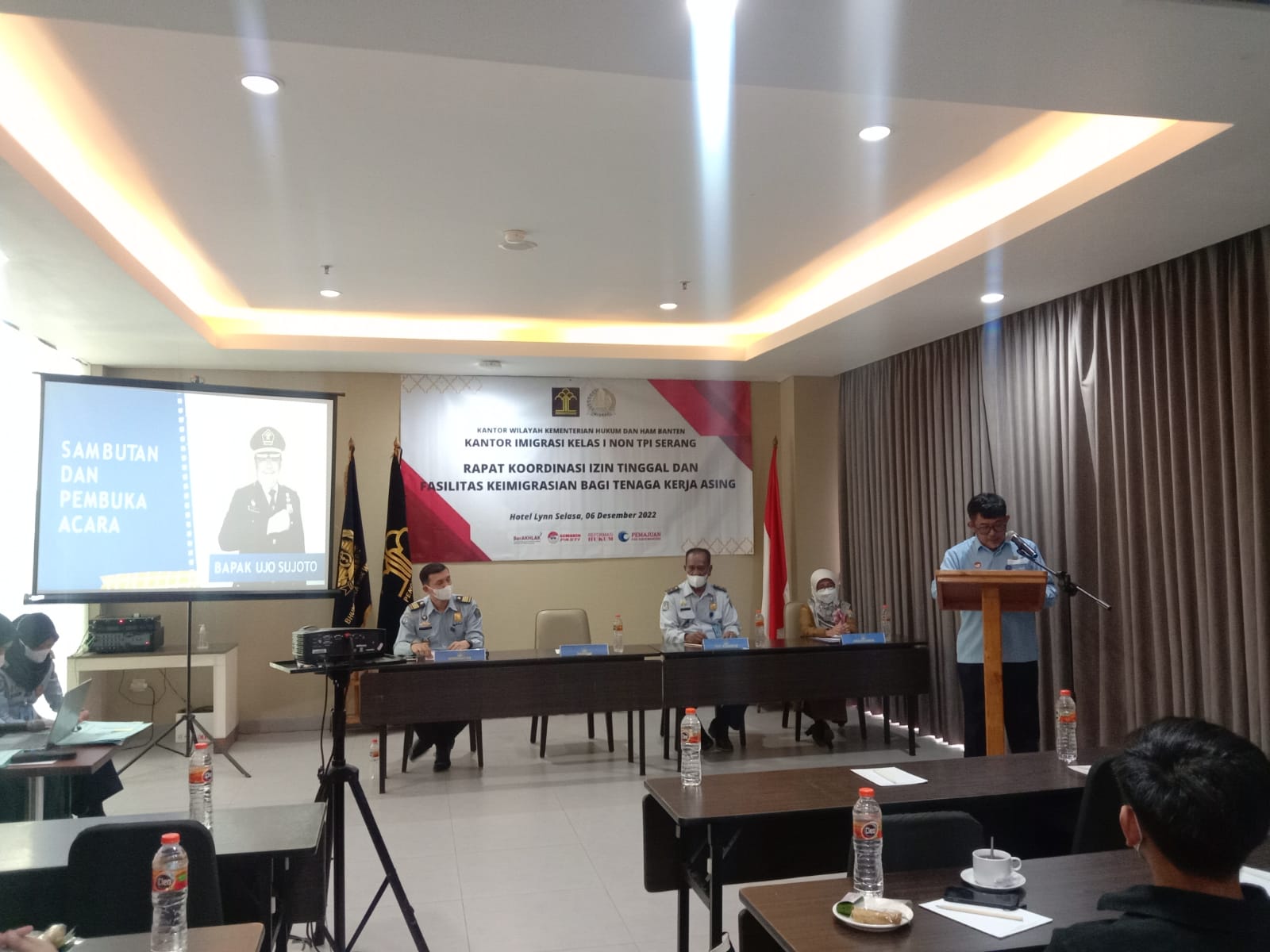 SERANG – Kepala Divisi Keimigrasian Kantor Wilayah Kemenkumham Banten, Ujo Sujoto menghadiri rapat koordinasi terkait izin tinggal dan fasilitas keimigrasian bagi tenaga kerja asing. Selasa, (06/12).