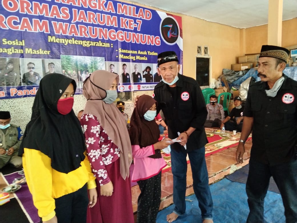 SIBERINDO.CO – Koordinator Cabang (Korcam) ormas Jarum Kecamatan Warunggunung menggelar syukuran hari jadi Jarum ke 7 dengan rangkaian acara menyantuni puluhan anak yatim, pembagian ratusan masker kepada masyarakat dan pengguna jalan serta mancing mania yang merebutkan dua ekor kambing di kediaman Pembina ormas Jarum Usman di Kampung Selaraja Tengah, Desa Selaraja, Kecamatan Warunggunung, Minggu (7/3).