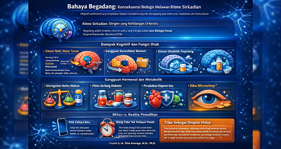 Masalahnya, tubuh tidak membaca jam seperti kita. Tubuh membaca ritme. Di pusat otak, ada “dirigen” kecil bernama suprachiasmatic nucleus (SCN) di hipotalamus. SCN mengatur ritme sirkadian 24 jam: kapan kita mengantuk, kapan hormon dilepas, kapan suhu tubuh turun, kapan sel memperbaiki diri, kapan sistem imun siaga, kapan metabolisme disetel ulang. Begadang membuat dirigen ini kehilangan orkestranya. Tubuh seperti dipaksa bekerja di zona waktu yang salah, berulang-ulang. Ketika ritme kacau, dampaknya bukan cuma “ngantuk besok”. Dampaknya menjalar sampai level gen, molekul, dan jaringan.