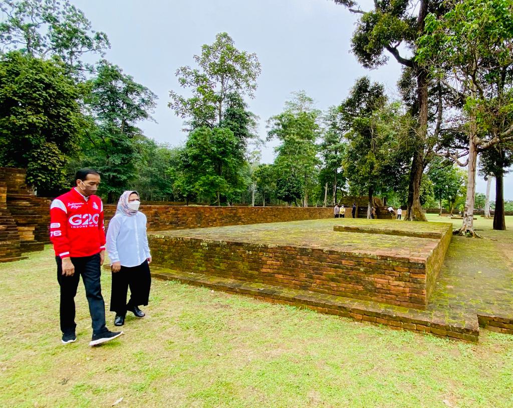 Presiden RI Joko Widodo (Jokowi) beserta Ibu Iriana Joko Widodo meninjau Candi Kedaton di Kawasan Cagar Budaya Nasional (KCBN) Muaro Jambi, Kabupaten Muaro Jambi, Provinsi Jambi, Kamis (07/04/2022). Presiden mengungkapkan bahwa kawasan bersejarah tersebut memiliki jejak-jejak peradaban yang harus terus dilestarikan.