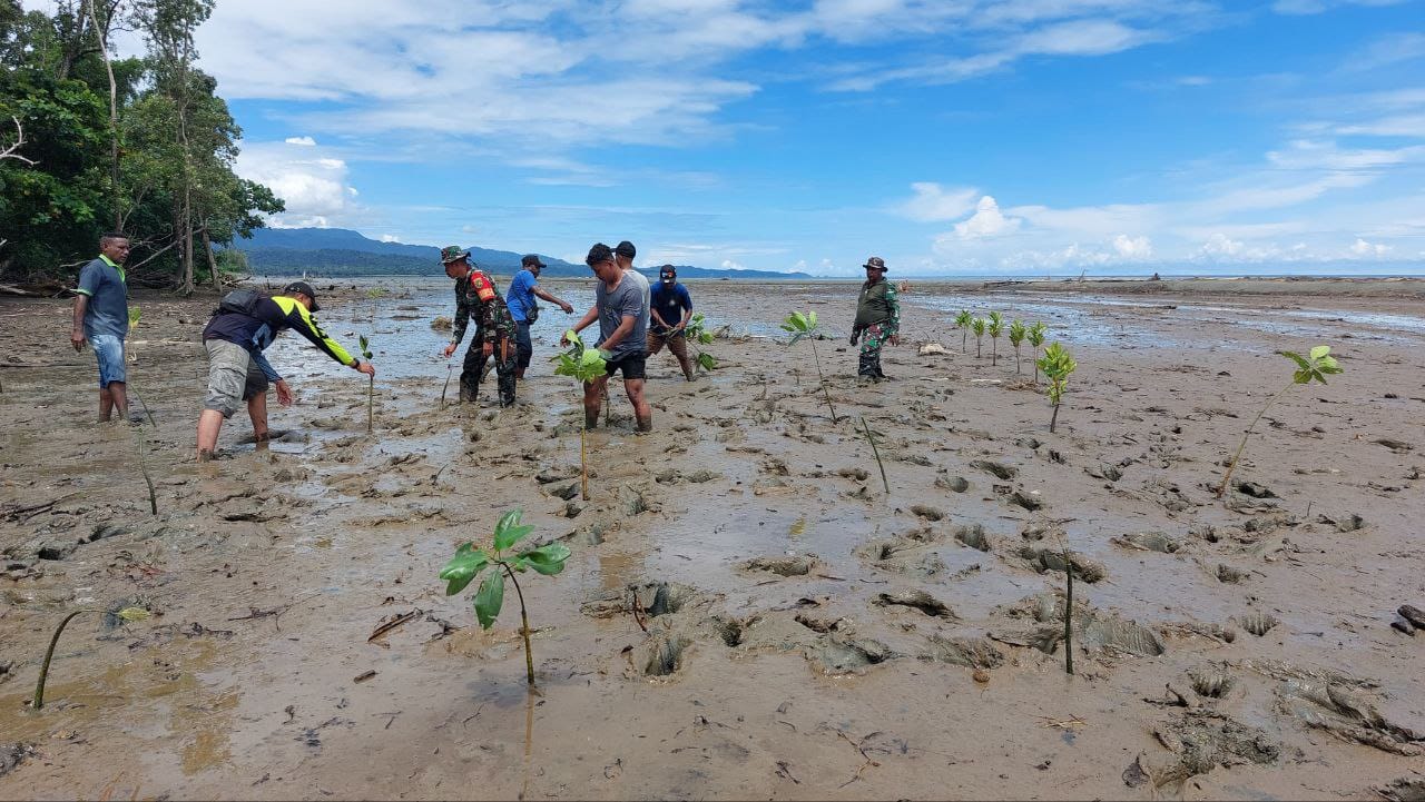 Serui – Guna menjaga kelestarian alam, khususnya dilingkungan pesisir pantai yang ada diwilayah binaannya, Kapten Inf Marselus Worabay Danramil 1709-01/Serui beserta anggota Babinsa dan masyarakat binaannya, menggelar penanaman bibit mangrove yang berlokasi dipesisir pantai Kampung Panduami, Distrik Kosiwo, Kabupaten Kepulauan Yapen, Sabtu (7/9/2024).