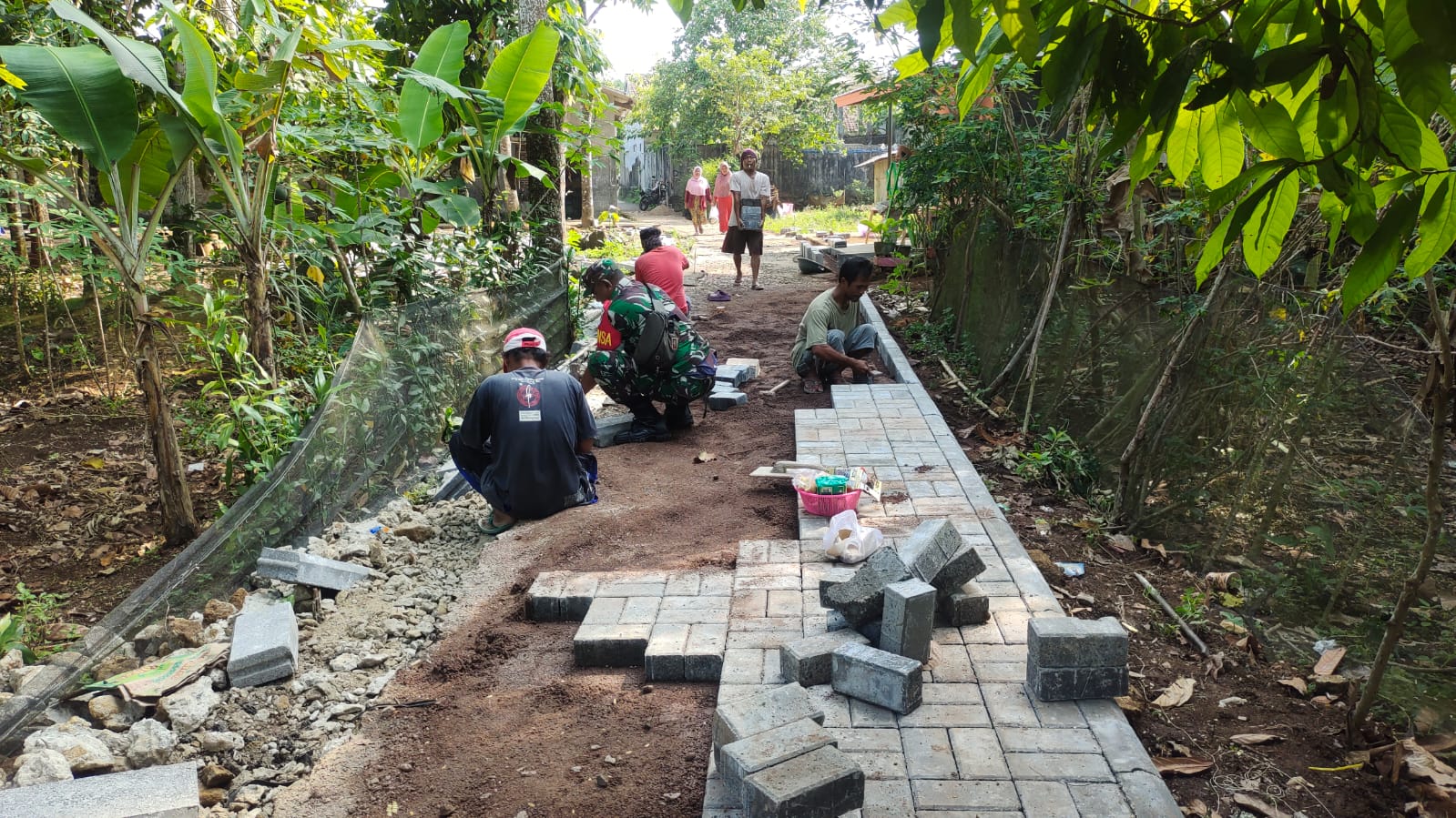 Bertempat di di Kp Sawah desa Purwaraja Kecamatan Menes Pandeglang Banten bersama masyarakat sekitar, Kopka Tata Suardi melaksanakan karya bakti membantu pemasangan paving blok. Kegiatan tersebut dilakukan oleh Babinsa sebagai upaya untuk mempererat silaturahmi dengan masyarakat di desa binaan.