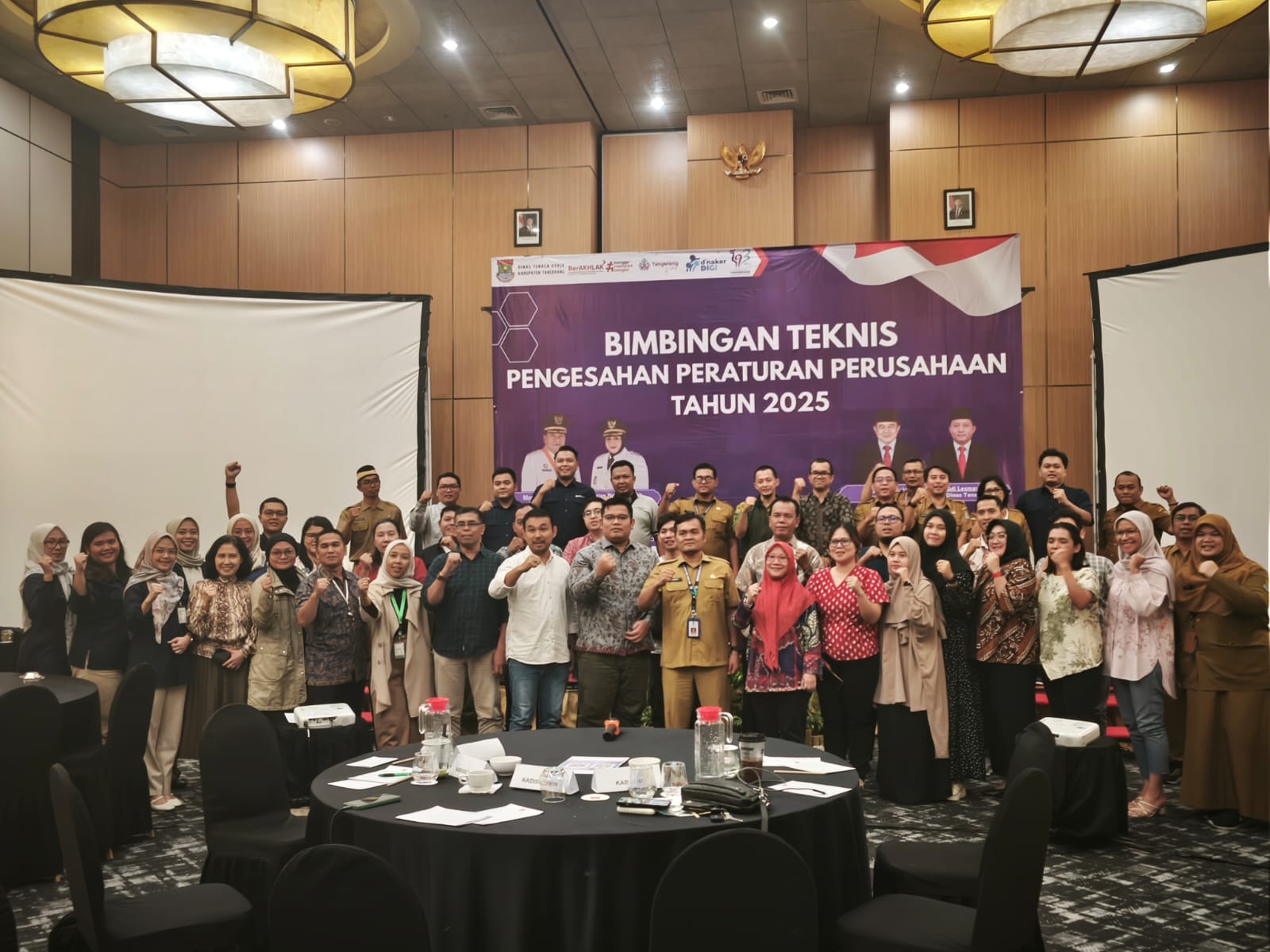 TANGERANG – Badan Penyelenggara Jaminan Sosial (BPJS) Ketenagakerjaan Cabang Kabupaten Tangerang menghadiri Bimbingan Teknis (Bimtek) Pengesahan Peraturan Perusahaan Tahun 2025 yang diselenggarakan oleh Dinas Ketenagakerjaan Kabupaten Tangerang.