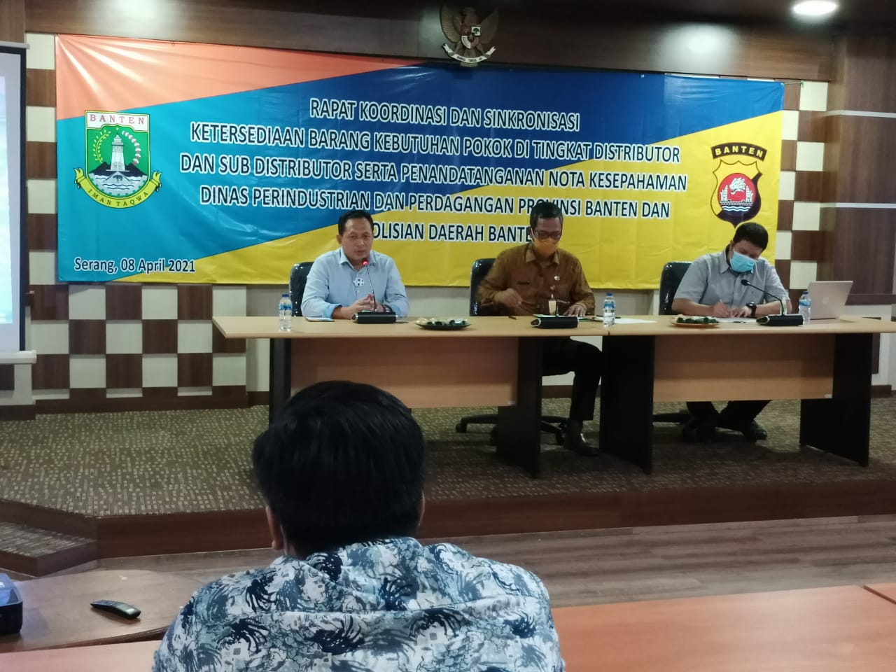 SERANG – Dirreskrimsus Polda Banten Kombes Pol Joko Sumarno hadiri Rapat kordinasi dan sinkronisasi ketersediaan barang kebutuhan pokok di tingkat distributor dan sub distributor serta penandatanganan nota kesepahaman Dinas Perindustrian dan Perdagangan (Disperindag) provinsi Banten dan Polda Banten di Aula kantor Disperindag Banten, Kamis (08/04/2021).