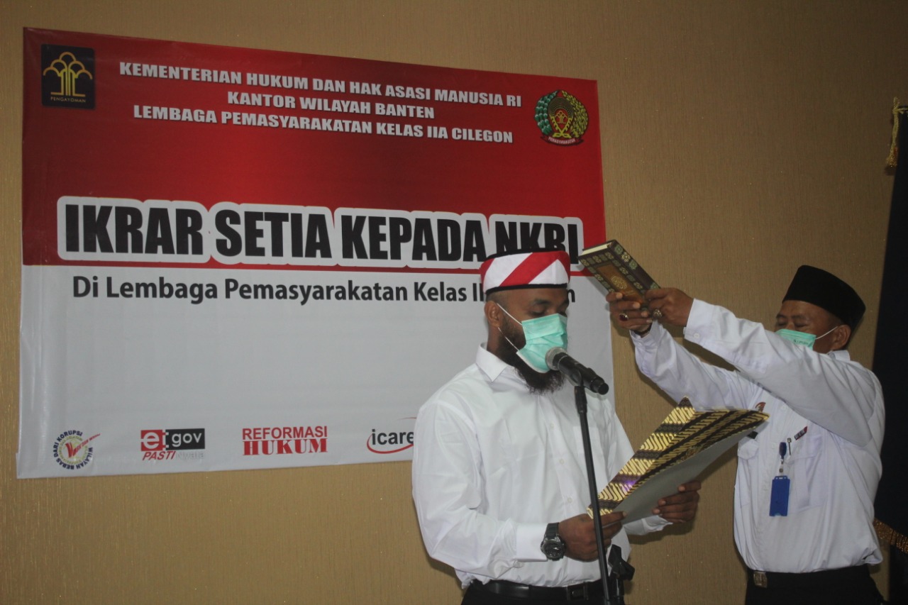 Tanpa adanya paksaan dan bujuk rayu, 2 narapidana teroris Lembaga Pemasyarakatan Kelas IIA Cilegon meminta untuk berikrar setia kepada Negara Kesatuan Republik Indonesia (NKRI). Permintaan tersebut direalisasikan oleh pihak lapas dan disaksikan oleh perwakilan BNPT, Densus 88, Dit Intelkam Polda Banten, Polsek Cibeber dan Koramil Cilegon. Kamis (08/04/2021).