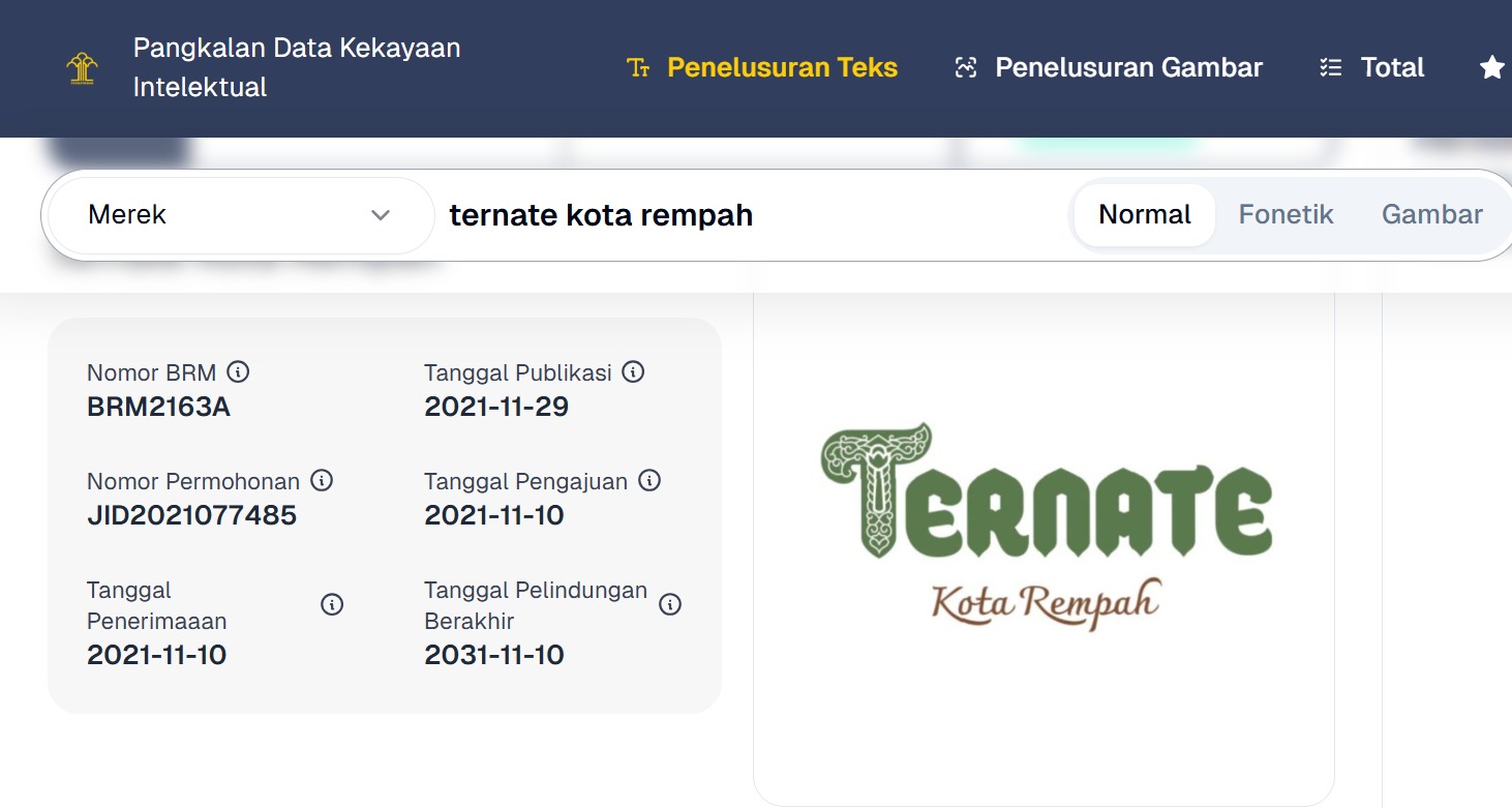 Merek Ternate Kota Rempah merupakan city branding dalam membangun pariwisata dan ekonomi masyarakat, telah terdafttar pada DJKI Kemenkum dengan nomor registrasi IDM000984109.