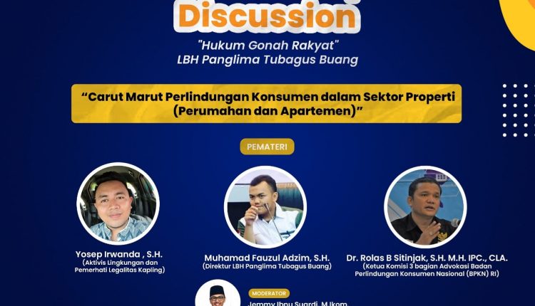 Serang – LBH Panglima Tubagus Buang Mengadakan Focus Group Discussion bertemakan “Carut Marut Perlindungam Konsumen dalam sektor Properti” acara di mulai dari jam 13.00 – 15.00 via Aplikasi Google Meeting.